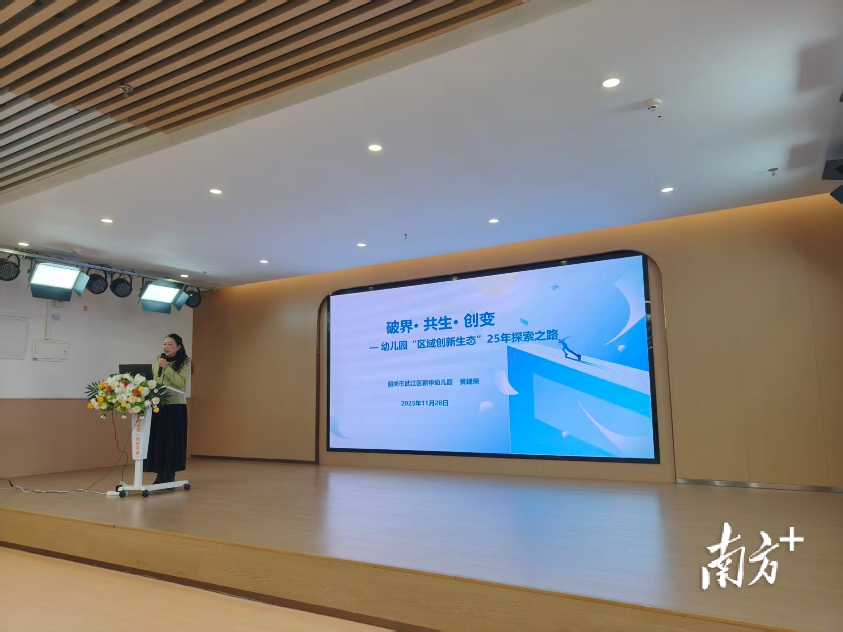 新华幼儿园与深圳实验幼儿园教研团队联合开展三场平行教研沙龙,围绕“区域活动组织策略”“主题课程设计与实施”“幼儿学习故事呈现”三大议题展开深度对话,参会教师结合教学实践分享经验、提出困惑,专家团队现场答疑解惑,形成“经验共享、问题共解”的良好互动格局。武江区教育工会主席、公办幼儿教育集团党委书记黄建荣以“破界·共生·创变——幼儿园“区域创新生态”25年探索之路”为题作专题分享,阐释区域游戏从基础区角到无界创生活动的五阶演进路径,亮出“破界、共生、创变”的创新生态模式。