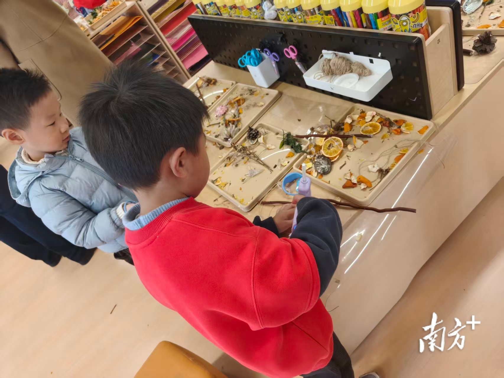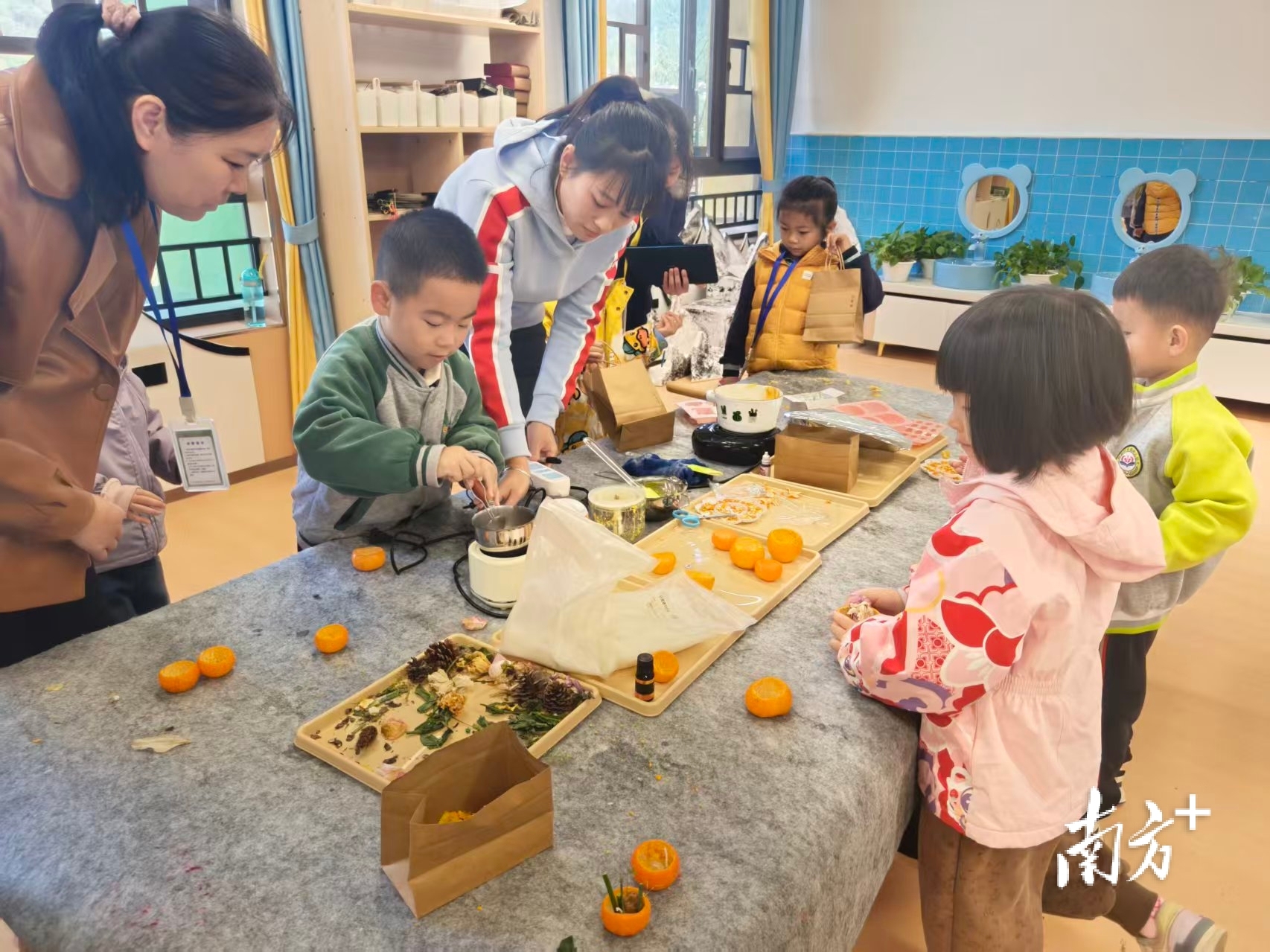 “老师,你看这是我自己做的橘子香包和橘子香皂。” 在武江区新华幼儿园新城园内,一名大班幼儿兴奋地向参观教师展示他的作品;在木工、手工区,中班的幼儿们已经能熟练操作热熔胶枪以粘合手工作品……教学展示环节,新华幼儿园三位教师带来主题课程与区域游戏融合的课例,通过情景创设、互动游戏等形式,生动演绎“以游戏为基本活动”理念下的课程实施路径,为现场教师提供可借鉴的教学范本。来自曲江区的王老师边记录边感慨:“回去我也要尝试把课程目标融入区域活动,让孩子在玩中学。”